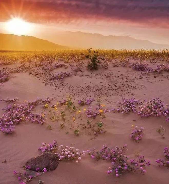 這裡的神奇氣候當然不僅於此,2015年的厄爾尼諾現象為阿塔卡馬帶來了一場超乎以往的大雨,沙漠土地裡休眠的各種花朵種子瞬間發芽、生長、開花,在這以往死寂的沙漠綻放。