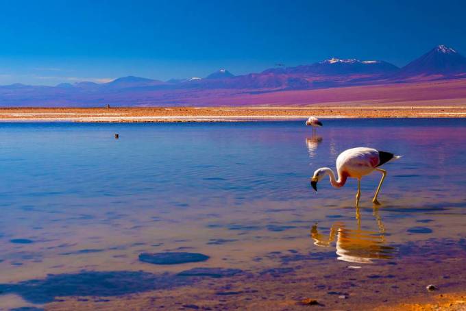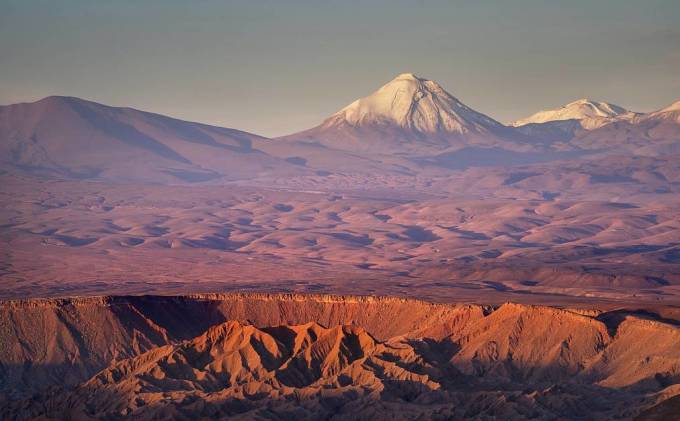 在“旱極”阿塔卡馬沙漠,大自然的鬼斧神工塑造出了迷人景緻。寬廣的鹽鹼地和永恆的雪火山遠遠望去別具情致。