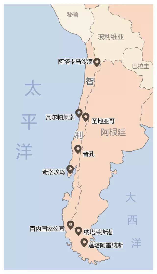 智利東邊是高聳入雲的安第斯山脈,西邊是浩瀚無垠的太平洋,北邊是滴水不見的阿塔卡馬沙漠,南邊是荒涼難行的巴塔哥尼亞地區。地理位置斷絕南美,與世相隔。