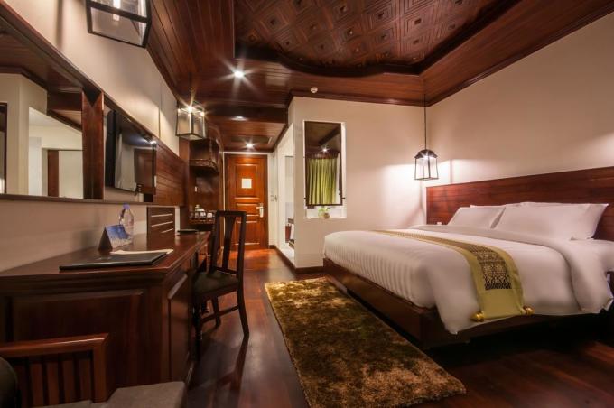 這裡所有建築都是以木質構造為主,配以雕刻木質花紋的地板與天花板、鍍金的家具裝飾,還有各種絲綢和高棉手工藝品,如果你也熱愛異域風情的體驗,一定能感受到不虛此行的滿足。