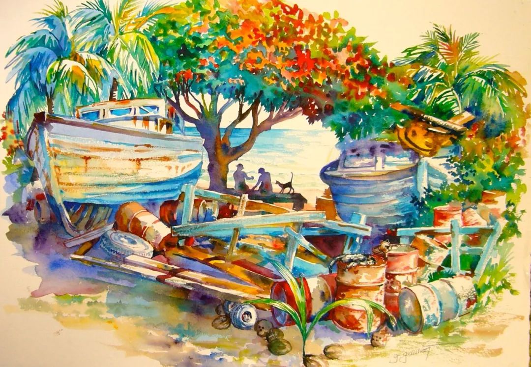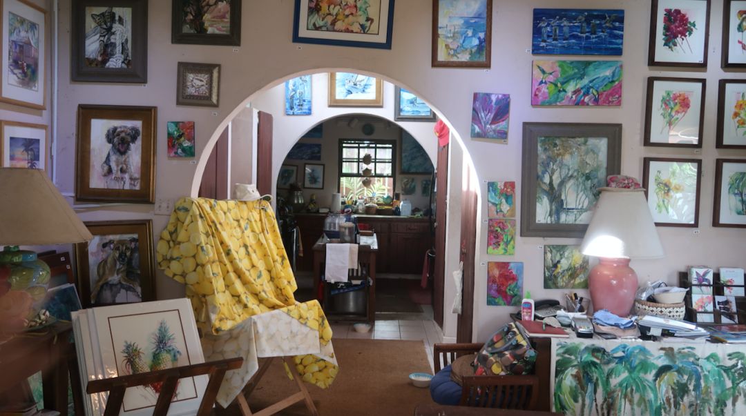 走進她家先感受到的是一片寧靜和美,她家牆上掛著250幅她的水彩畫,內容靈感全都來自美麗的加勒比。有風景、有動植物,水彩特有的生動、流動性,讓她家像一片幽靜的池塘,透著光影的深淺,好看極了。