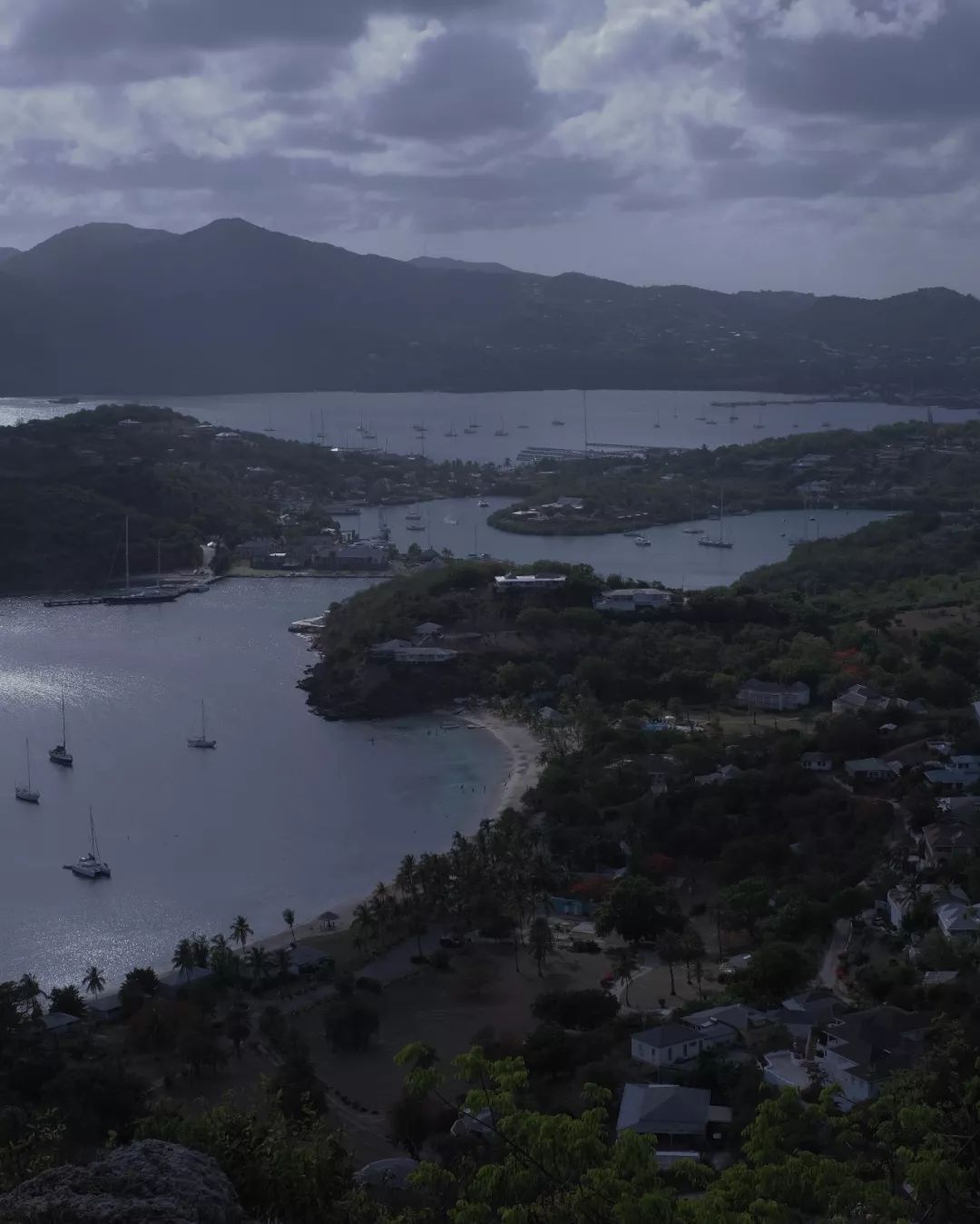 這裡也是看日落的好地方,從高處遠眺英格蘭海港(English Harbour),能看見一派令人心醉的景象:碧藍如夢的海水上,白色的遊艇和帆船點綴其中,岸上綠翠成蔭,遠處山峰連綿不絕,被日落的光線漸染,像一幅壯美蒼翠的畫作。