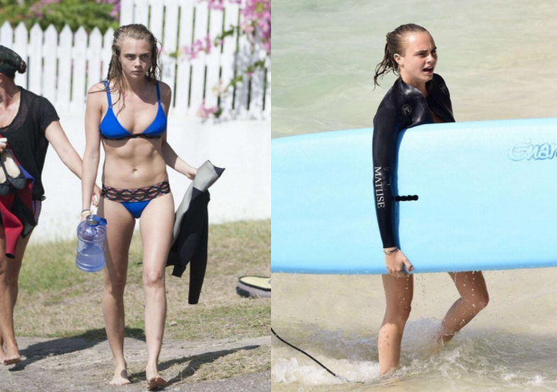超模卡拉·迪瓦伊在巴巴多斯衝浪