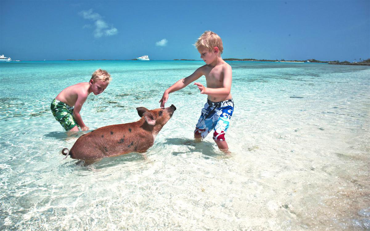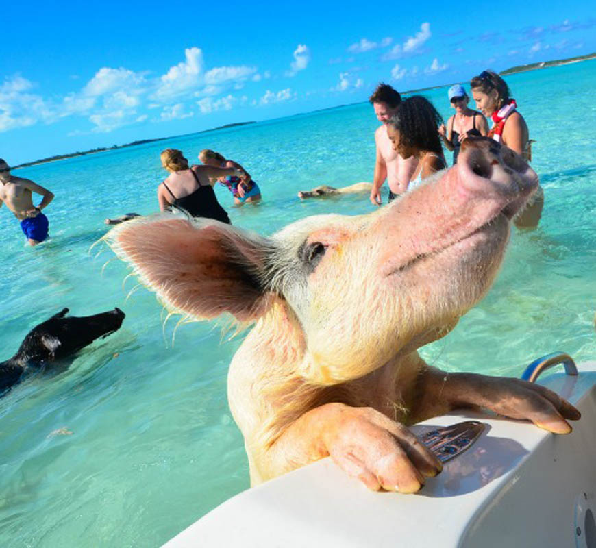 ”水清沙幼,了無人煙,豬豬們或在水中嬉戲,或成群結伴地游泳,又或者只是單純地躺在沙灘上享受日光浴,自由自在,無拘無束,過著佛系的豬生” 。這引人入勝的奇妙景象幾乎霸占著所有巴哈馬旅遊照的封面~
