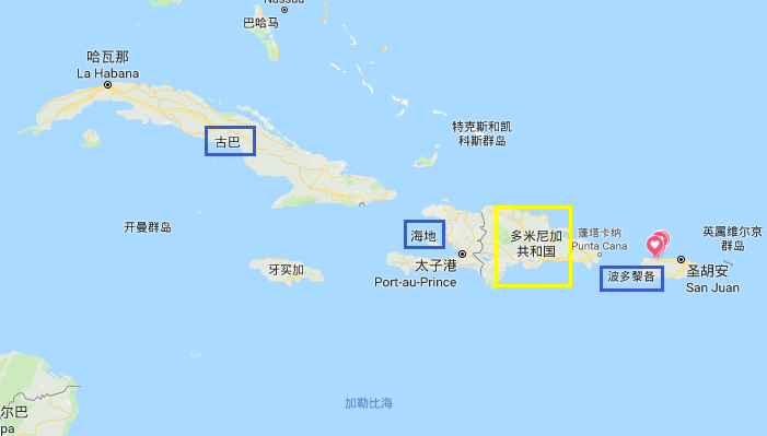 多米尼加共和國與海地共處於西班牙島,與波多黎各隔海相望。西班牙島的面積僅次於古巴,是加勒比海第二大島。