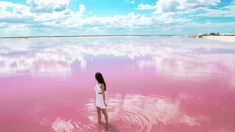 之前澳大利亞粉紅湖“褪色”的消息引起了全世界的轟動,也因此帶動坎昆的粉紅湖更加的火熱。粉紅湖之所以是粉紅色,源於水中大量的紅色浮游生物水藻、海蝦;湖水鹽分較高,因此湖水平均深度差不多在一英尺左右,可以直接平躺或是倒立拍照~當水分不斷蒸發時,粉紅湖邊就會形成大量的鹽沙堆積景象。