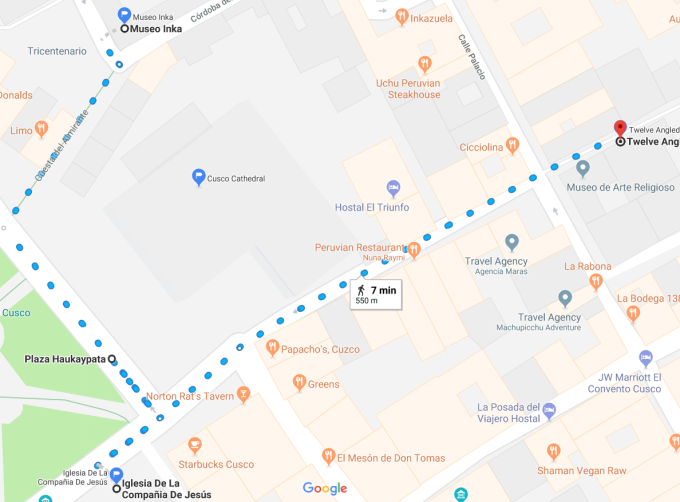 從印加博物館出發(Museo Inka),參觀完博物館一路沿著Cuesta de Almirante往山下方向走一個街區就可到達武器廣場的耶穌會教堂(Iglesia De La Compañia De Jesús),耶穌會堂的鐘樓是可登頂的,在樓頂窗台可俯瞰整個武器廣場。著名的庫斯科大教堂(Cusco Cathedral)就在耶穌會堂的對面,裡面存放著秘魯版的“最後的晚餐”,畫中耶穌面前的盤子裡裝著的是一隻烤豚鼠。午餐過後可沿著triunfo街來到印加古牆和著名的十二邊形印加石(Piedra de los 12 Angulos)。Triunfo街同時是一條琳瑯滿目的商品街,秘魯高山地區的特色紀念品都可以在這裡看到。