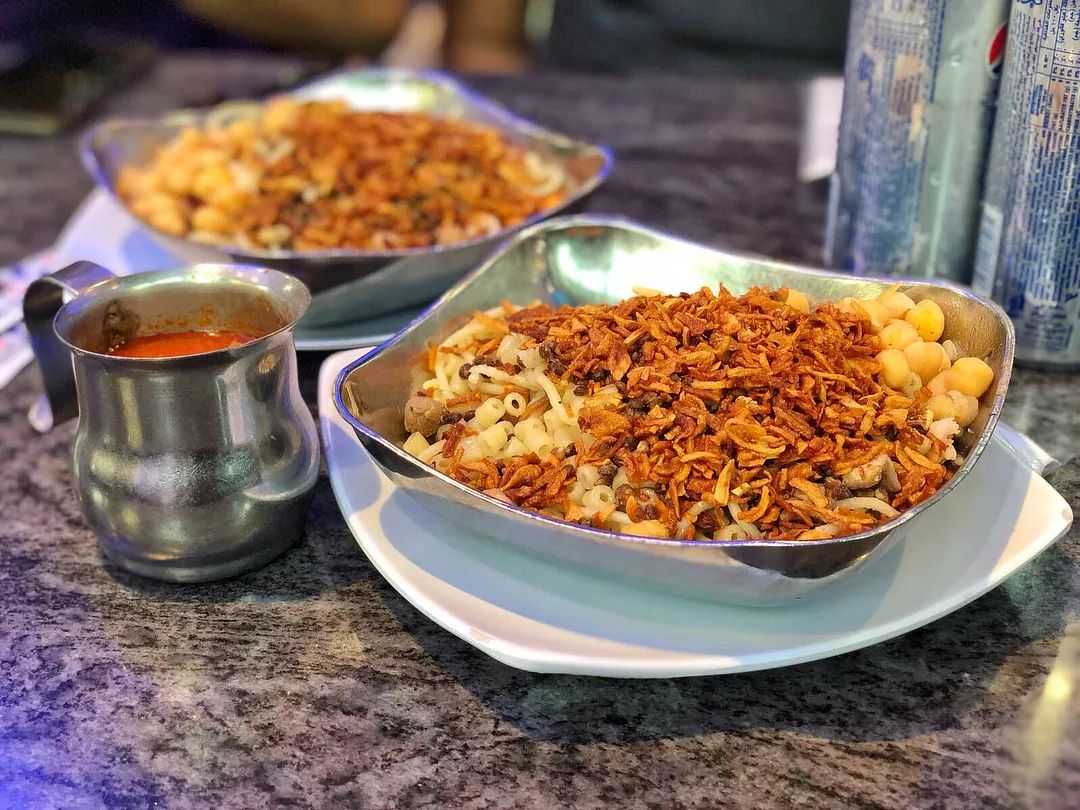 在開羅市中心的Abou Tarek,主打最受歡迎的埃及國菜Koshary——用番茄醬,米飯和扁豆做的通心粉,上面蓋滿脆皮洋蔥,據說這家最地道。