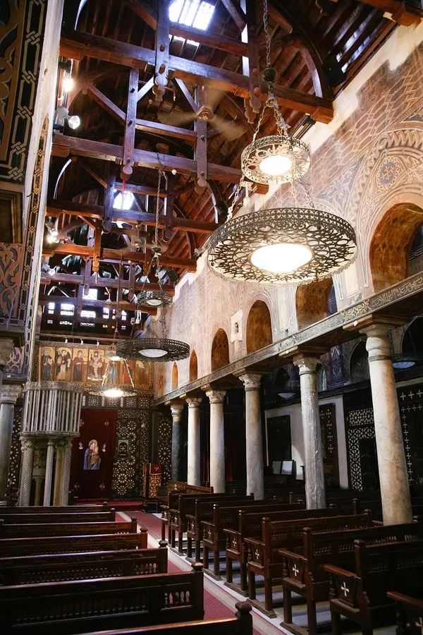 這座教堂的獨特之處,在於其天花板是以諾亞方舟的形狀製成的。因為它建在開羅科普特老城中巴比倫要塞入口的頂部,進入教堂需要攀登29級台階,而被稱為懸空教堂,建築本身很漂亮。