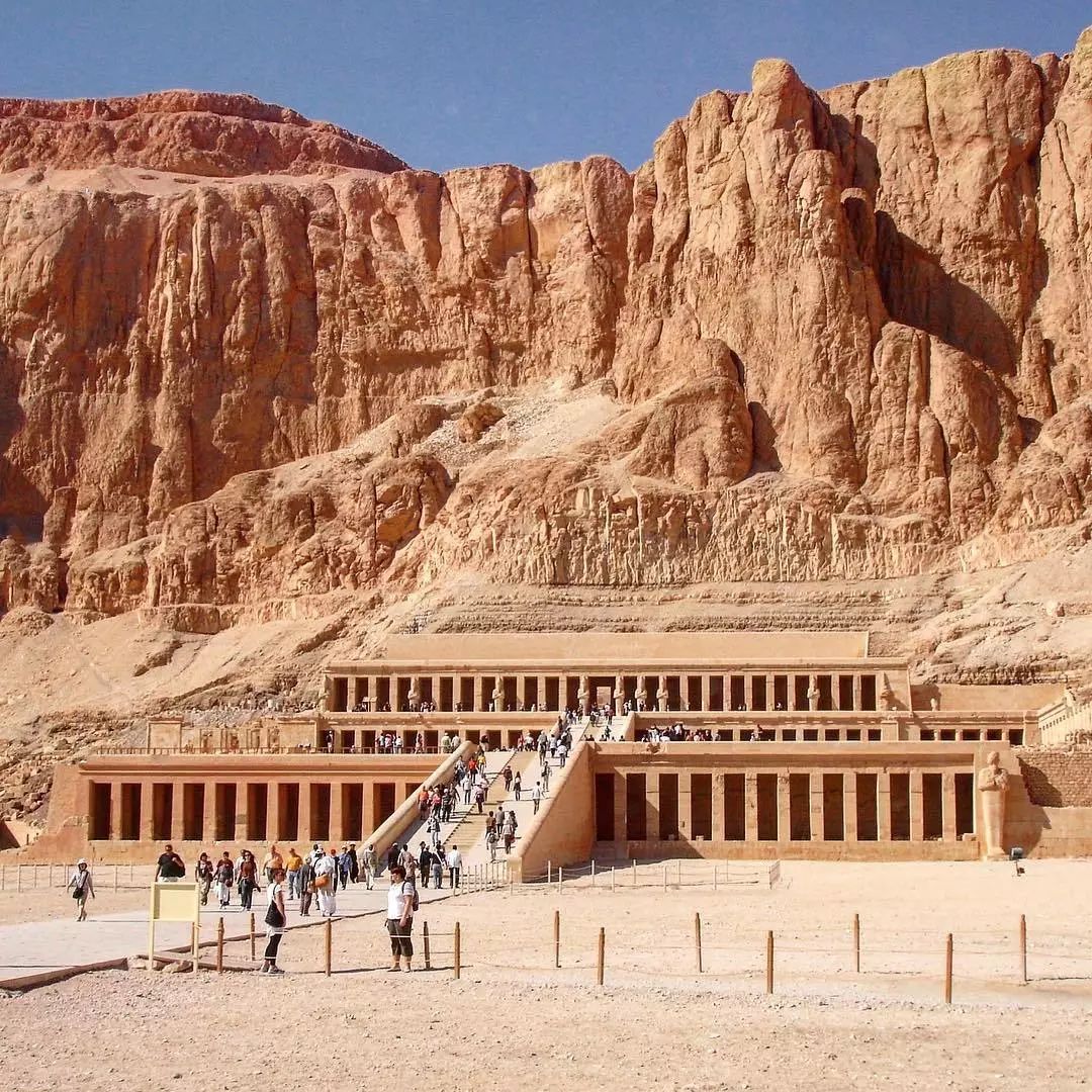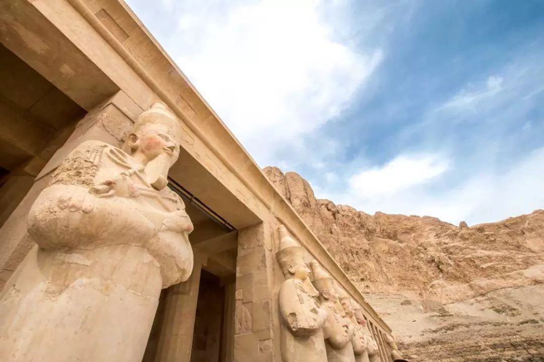 帝王谷附近可供參觀的,還有這座埃及唯一的女王神廟。哈特謝普蘇特開創了各種貿易路線,引領著王國走向繁榮,許多戴假鬍鬚、身著男裝、手執權杖、威嚴無比的女法老人型神像,矗立在三層神殿之上。