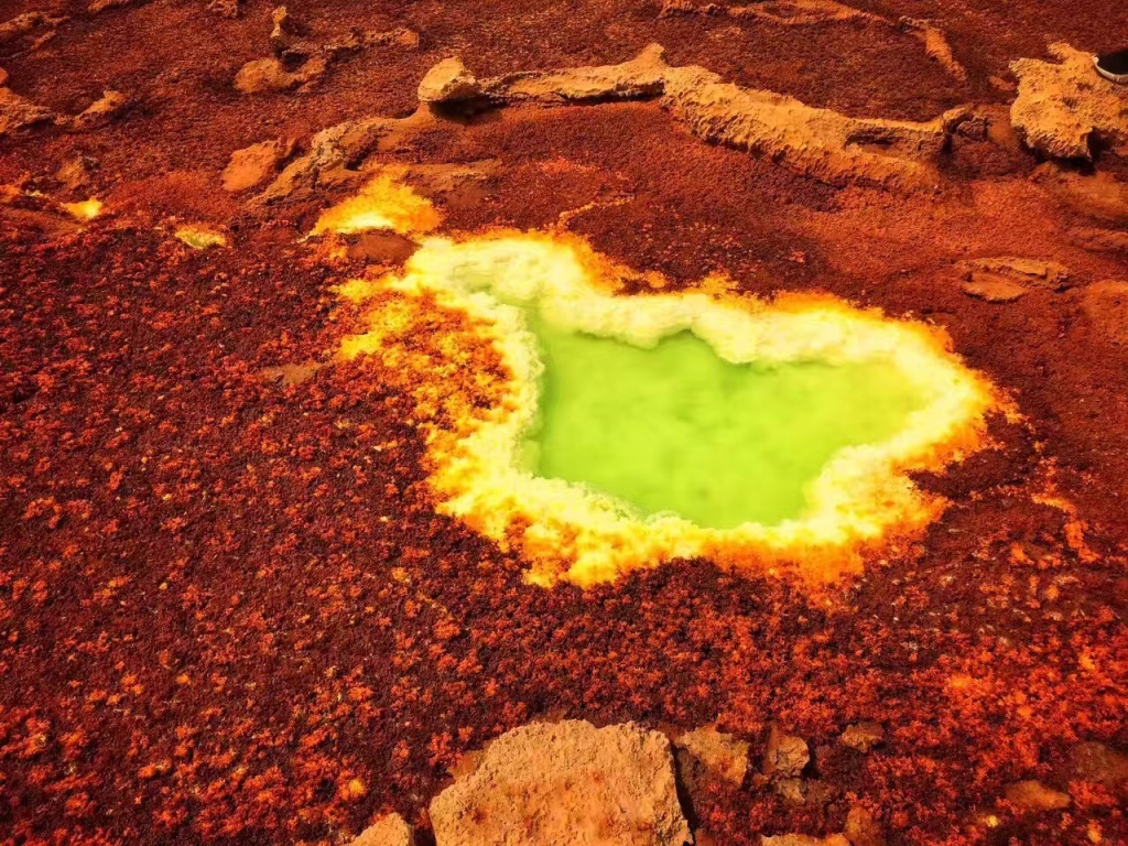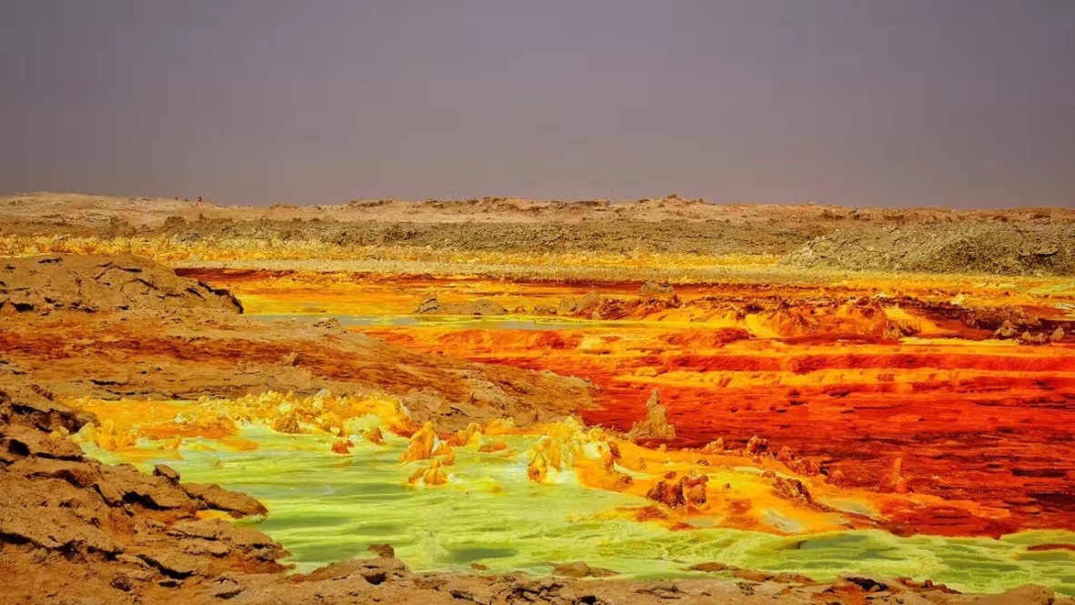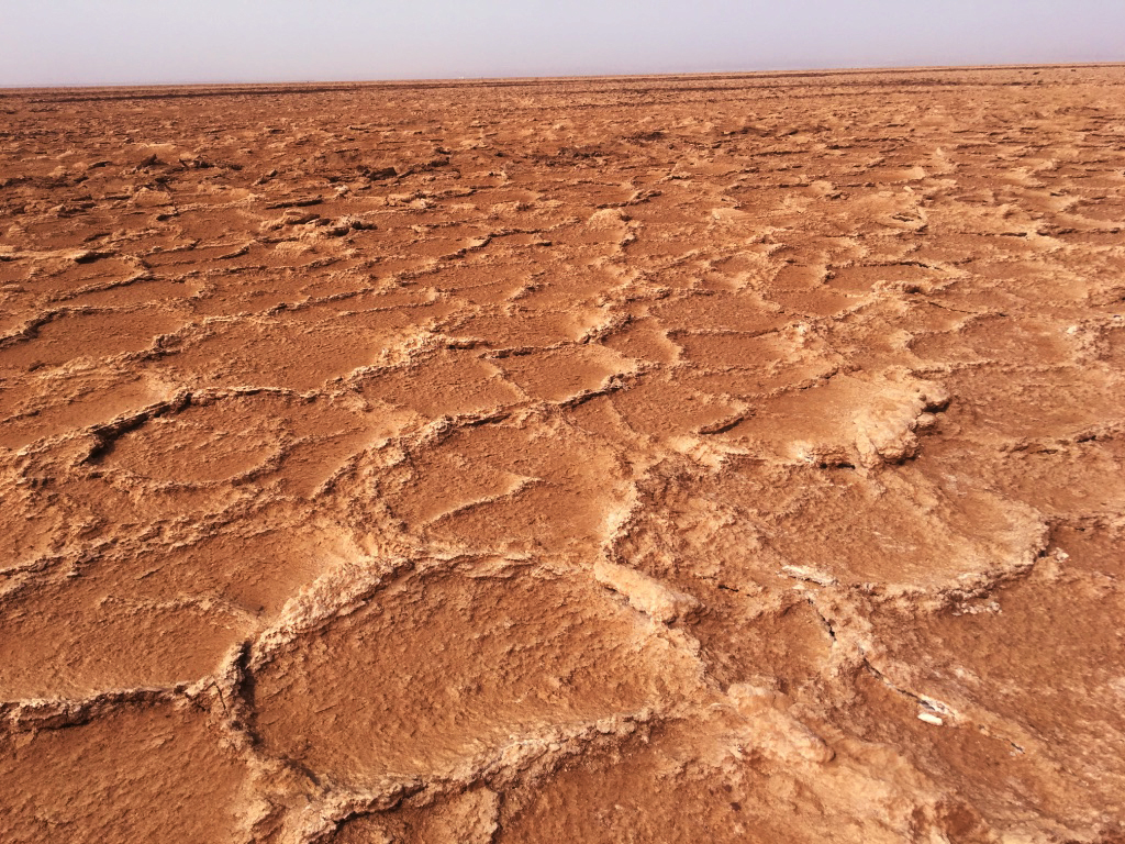 在路上顛簸3小時後,到達達洛爾硫磺湖(Dallol)。車內的溫度計顯示室外溫度51度。打開車門,一股熱浪迎面撲來。太陽在無雲的天空中無情地烘烤著大地,周圍的一切彷彿都慢了下來。