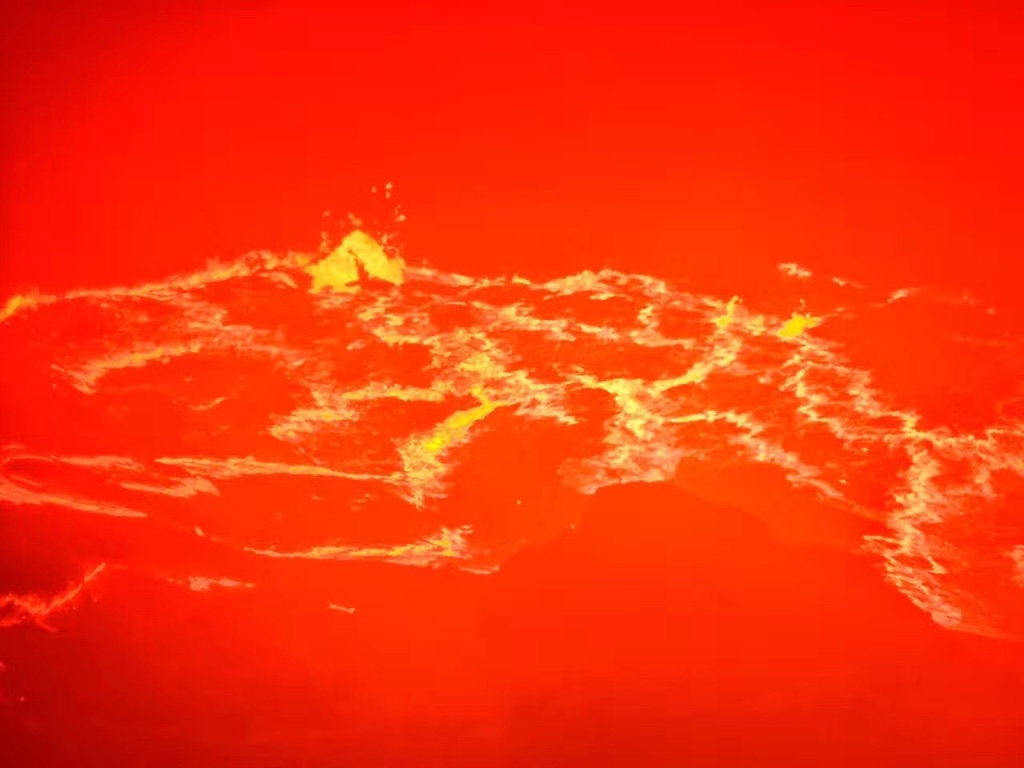 11點左右,到達山頂後,可以看到煙霧繚繞的火山口近在咫尺。順著陡峭的懸崖,可以到達火山口。熔岩在眼前沸騰,噴湧,起舞,在空中留下一道道划痕,周圍的岩石被岩漿映照的赤紅,震耳的轟鳴聲隨風層層散去。