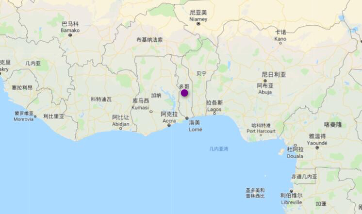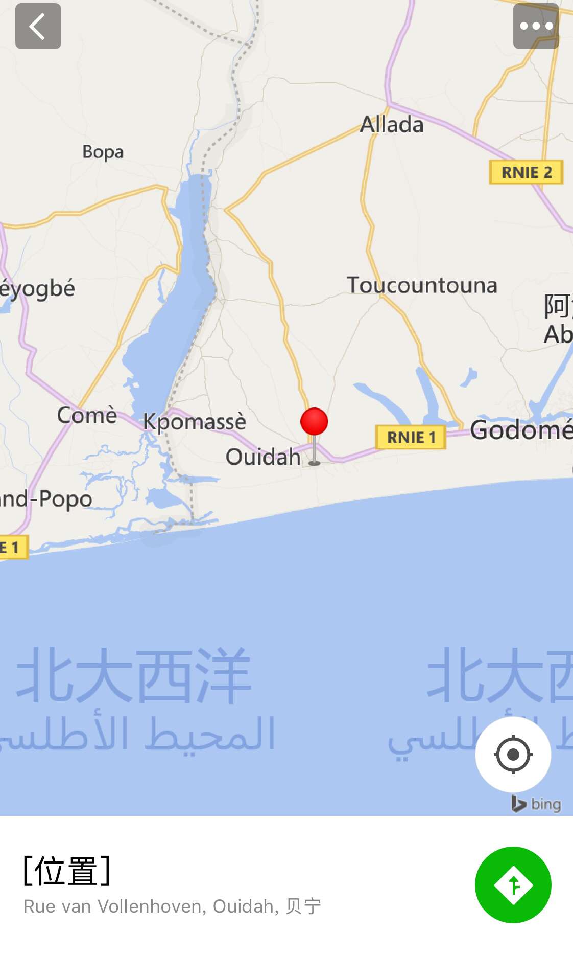 蟒廟的位置不太好找,因為地圖上沒有名字,這是我到了之後發的一個定位,不過這裡的當地人都會知道,你如果到了維達,找個人帶你去就可以了,帶我去的人是貝寧 APSONIC的一個銷售總監,在中國留學五年,武漢大學的博士,人也帥,他到關口接上帶我去的蟒廟,還去了當年販賣奴隸的“不歸門”。