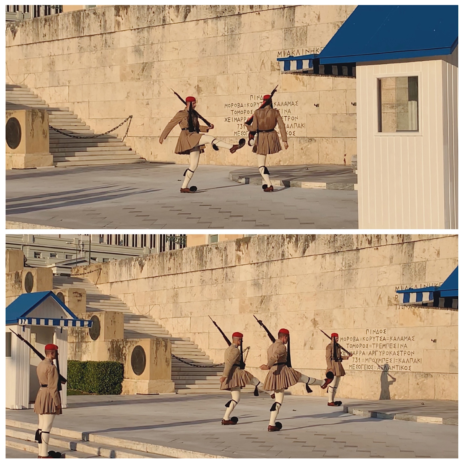 離雅典大學不遠,就是憲法廣場(Syntagma Square),這裡是雅典的中心區。憲法廣場有趣的是每隔一個小時,都會有一個換崗儀式。換崗的士兵邁著看不懂但有點可愛的步伐,穿著大頭鞋,每一步都在地上摩擦,交換崗位。