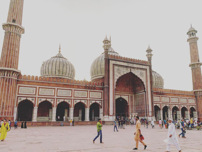 賈馬清真寺是另外一個故事。坐落於德里老城區,要進到這個地方,坐車是開不進來的,因為道路狹窄,摩托和Rickshaw極其擁堵,只能下車步行,還非常容易被摩托車給擦到。和世界上其他的清真寺不同,賈馬清真寺坐落於鬧市,卻佈局的非常闊達。
