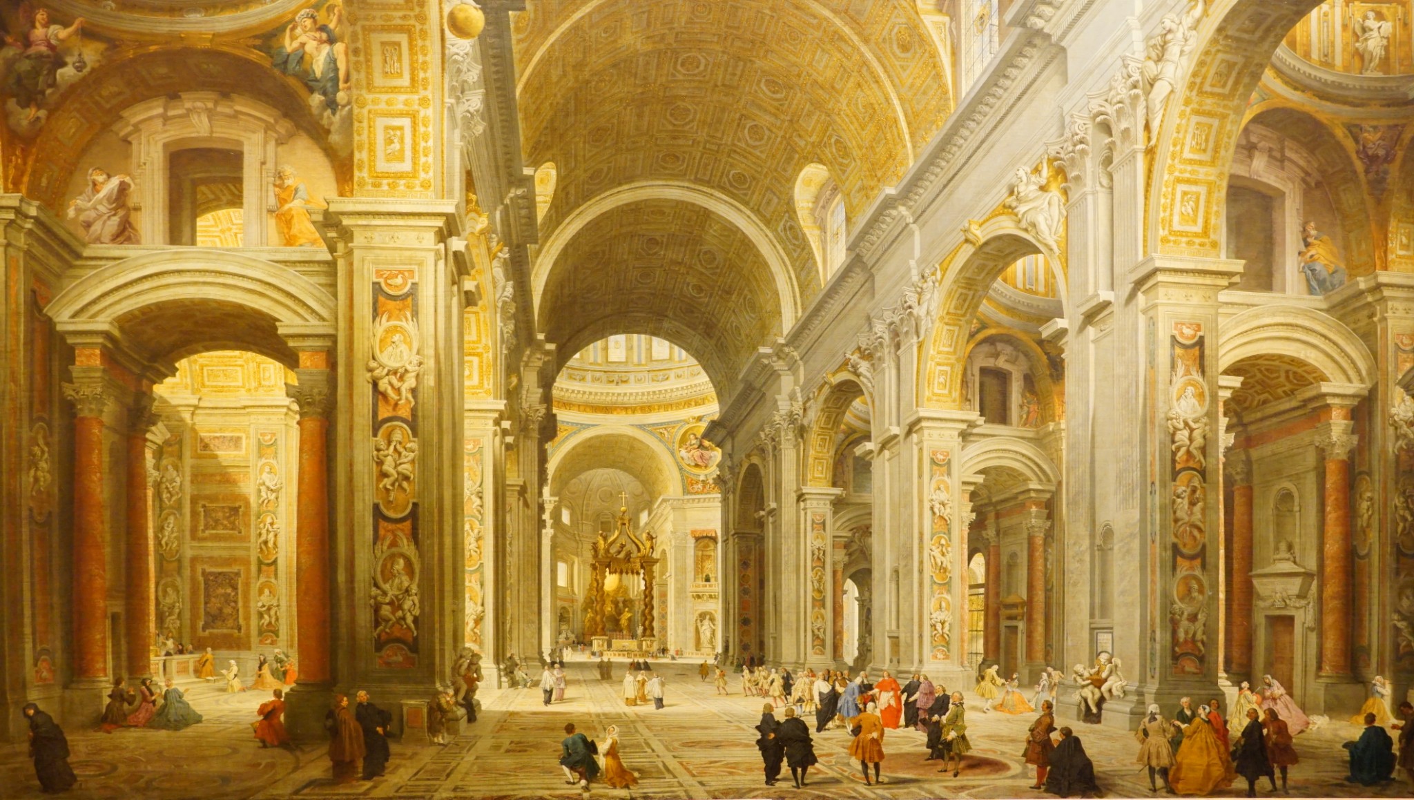 這幅畫的可是fandigang的聖彼得大教堂,從人的渺小可以看出教堂的宏偉
