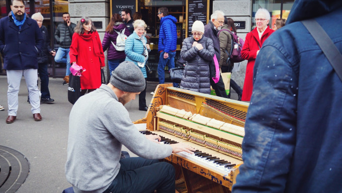 主火附近總是熙熙攘攘,這天遇到了演奏鋼琴的青年藝術家