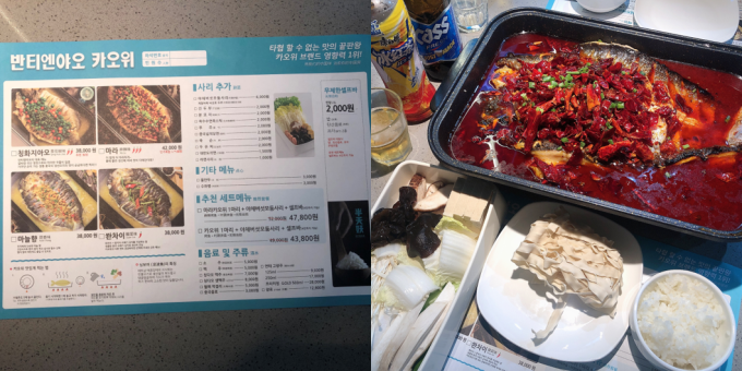 逛完鞋店出來有點餓,忽然聞到一陣熟悉的香味,跟著味道走,我們居然發現了一家烤魚店!名字是半天妖烤魚,看著門口還有人排隊,味道肯定不錯!來韓國吃了幾天韓餐,可太想念我們祖國的美食了,一行人拿上號,等了大概20分鐘就進去了,吃的那叫一個舒服呀~