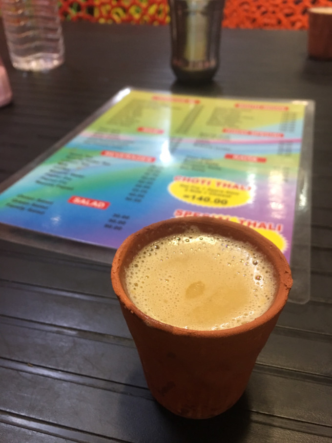 雖然來前大家都提醒我只喝瓶裝水不要喝當地的水,但是沒忍住,還是嘗試了滾燙的薑汁奶茶,然後就愛上了!當地人好像每天都喝,小小一杯,味道就是奶茶裡蘊含著濃濃的薑味。最新發現是印度人用陶瓷做一次性餐具,然後再打破重塑,還挺有意思的~