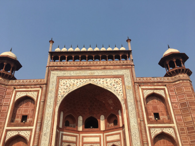 泰姬陵的正門,上面是22個小圓頂(拍了11個,後面還有11個),象徵著泰姬陵耗時22年整體完工。門上白色主牆體上的小花紋是用各種小石頭小貝殼一點點鑲上去的,22年已經很快了