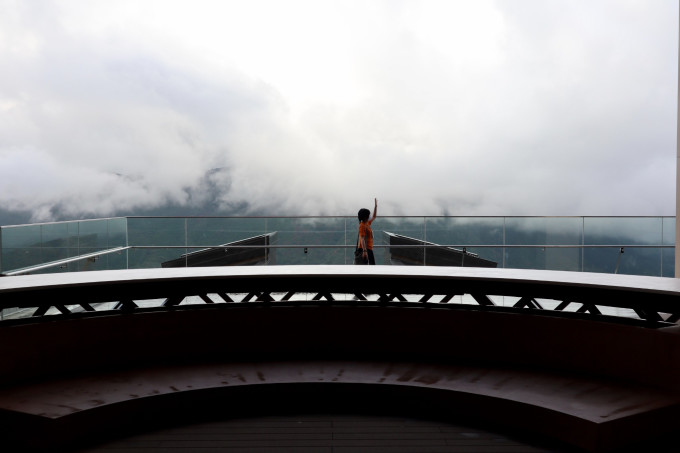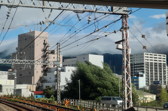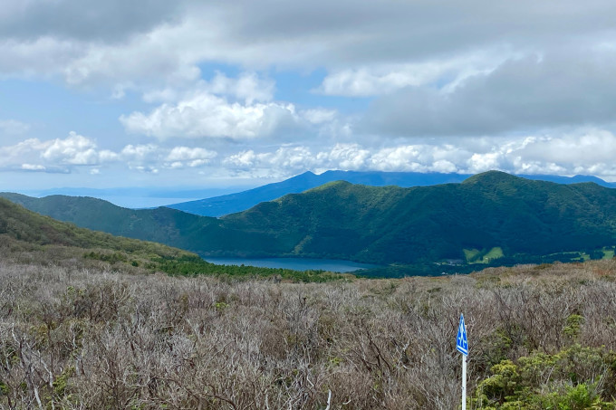可惜今天是陰天,快到箱根的時候天空才漸漸露出藍色,像是剛剛睡醒。不過天邊依舊多雲,遠方的矮山都被雲霧蓋住了頭,想看富士山恐怕更是不可能了。