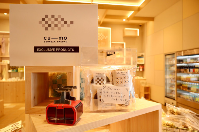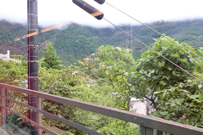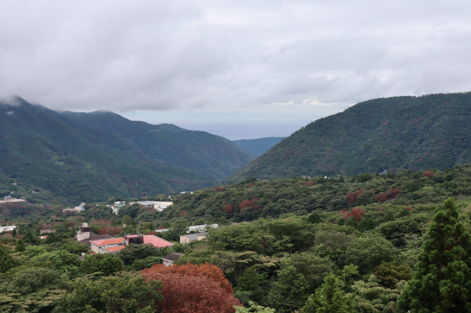 在站內有個小店賣各種伴手禮,外面有個帶免費足湯的展望台,能看到強羅的街景和箱根外輪山,遠方就是相模灣。儘管今天天氣不好,無法看到海灣,但是連綿山峰上的森林,卻也像迎面撲來的綠色海浪,散發著清新的氣息。站在展望台的邊緣,瀰漫在山頭快速移動的白色雲霧,會讓人有一種站在船上快速航行在這綠色海洋的錯覺,有點暈,但也很愜意。