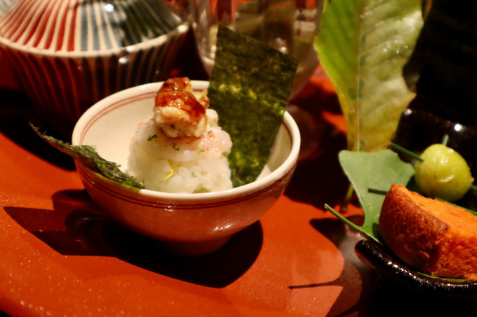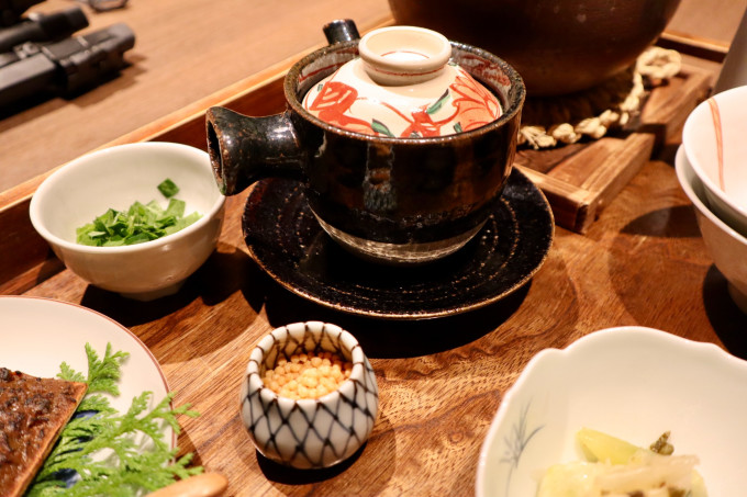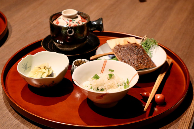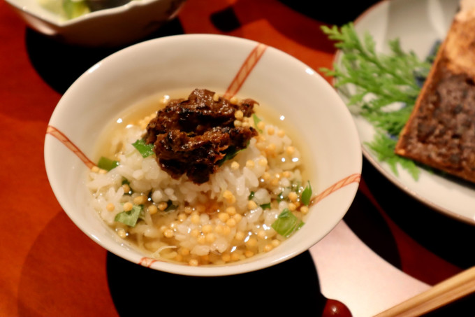 主食必須要認真說一下。茶泡飯,一種看似簡單,實則凝聚了功夫,而且趣味盎然的料理。這種源自平安時代的吃法,發展到今天早就不是一般人印像中那種味道寡淡的飯食了,變身成了可以讓身心愉悅的美食。私以為,翠松園的茶泡飯精髓就在那一小板味噌,至於說碗裡面像豆子一樣的東西,那是茶泡飯的標配,叫“ぶぶ霰(ぶぶあられ)”