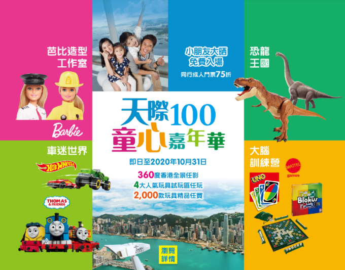 而且9月11日至10月31日期間,天際100聯同美泰兒(Mattel)玩具香港及澳門獨家代理– Kids Kingdom呈獻「天際100童心嘉年華」活動,將一眾玩具好朋友帶到上393米高空。